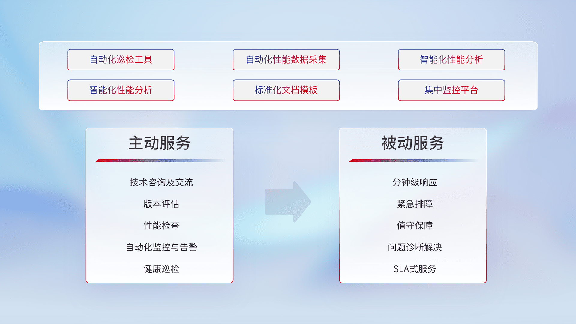 智能化工具和标准化文档,,保障服务质量,,,,提供主动服务(包含技术咨询、、、版本评估、、、性能检查、、、、自动化监控与告警、、健康巡检)和被动服务包含(分钟级响应、、、、紧急排障、、值守保障、、、、问题诊断解决、、、SLA服务)。。。。